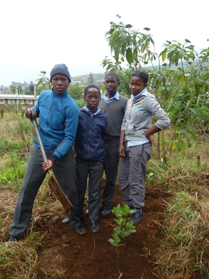 This week was National Arbor Week, South Africa’s celebration of indigenous trees and plants. Through a local businessman and our permaculture gardening initiative, iThemba was donated indigenous trees for all the different schools where we do Life Skills. The iThemba Gardening team came in to do a special lecture on the importance of sustainability in the Life Skills classes, then the kids got into groups and planted trees on their school property. Even though it was a cold, very muddy, very wet week, the tree plantings took place!