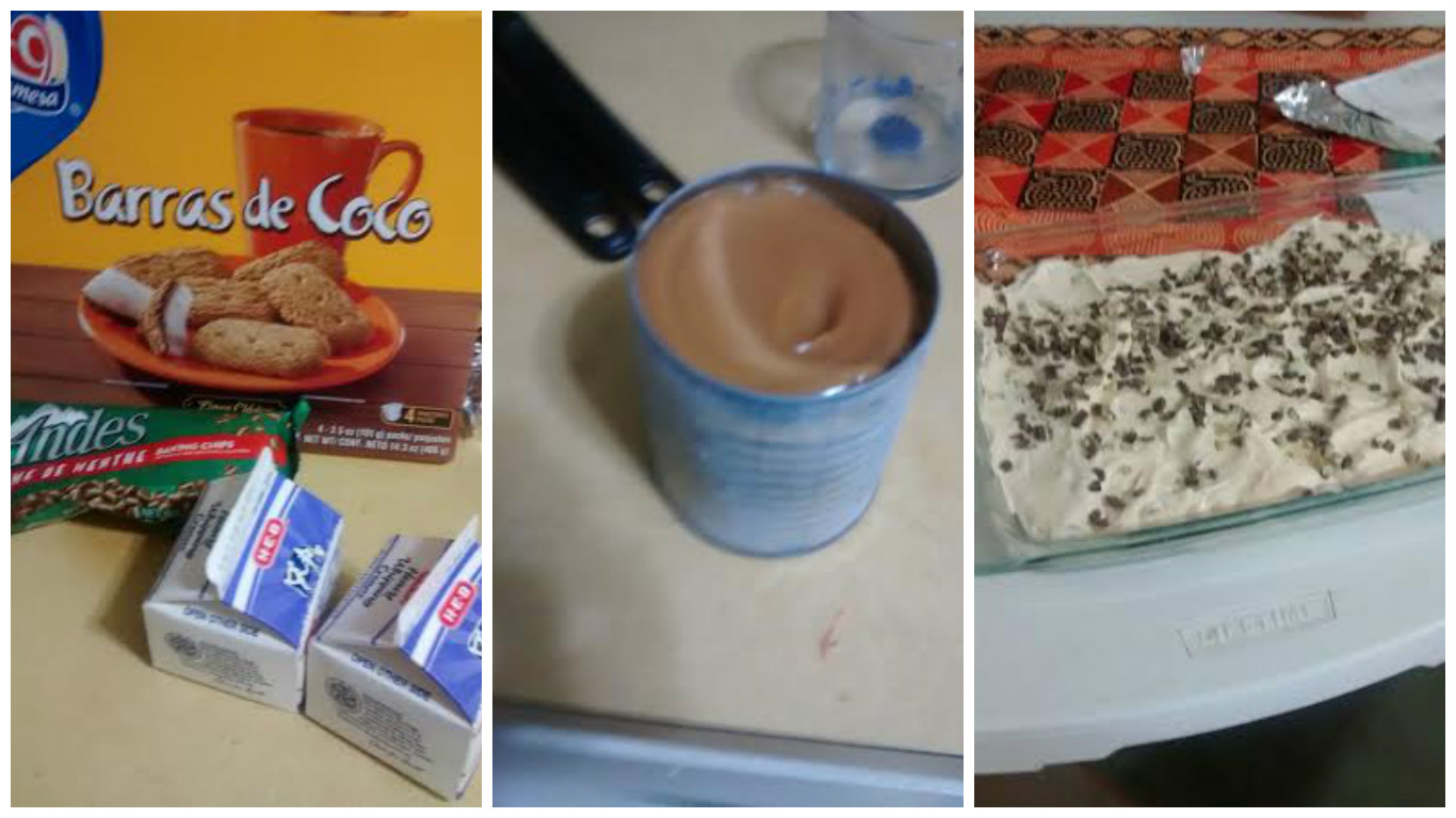 Here’s the ingredients: whipping cream (=same), coconut biscuits I found in the Mexican aisle (instead of tennis biscuits), Andes mint pieces (instead of peppermint crisp) and the BIG one: Sweetened condensed milk (instead of caramel treat). I boiled the tin of condensed milk for 2.5 hours using these instructions, and turned it into caramel treat. It worked! Best dessert ever.